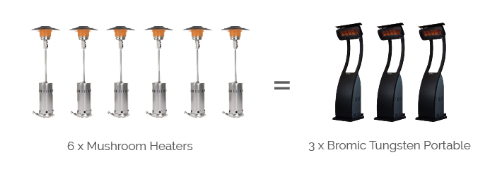 Portable heaters will approximately last around 9 hours on a single 9kg tank of LPG, depending on how powerful the heater is (usually between 30– 40MJ). Considering that one tank costs about $30 per refill, the cost benefits of a Bromic Tungsten Portable will quickly add up! For example, any pub and restaurant that currently has 6 mushroom heaters installed, could save around $45 every day, assuming that one tank of propane lasts for around 2 dinner services.