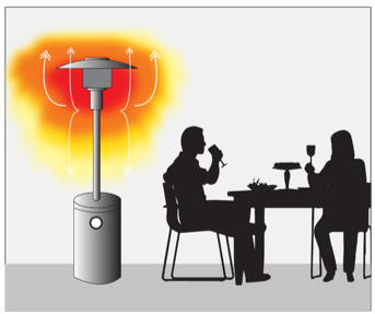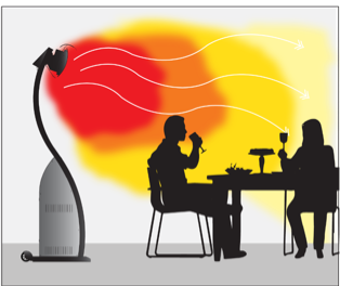 b) INFRARED HEAT: More innovative outdoor heaters use infrared heat. This method heats the target objects themselves as they come into contact with waves of infrared light. Unlike conventional mushroom heaters that warm the air around objects, infrared heaters work by projecting infrared radiation directly at the object to be warmed. This method is considered the most energy-efficient and effective method to heat people in an outdoor setting.