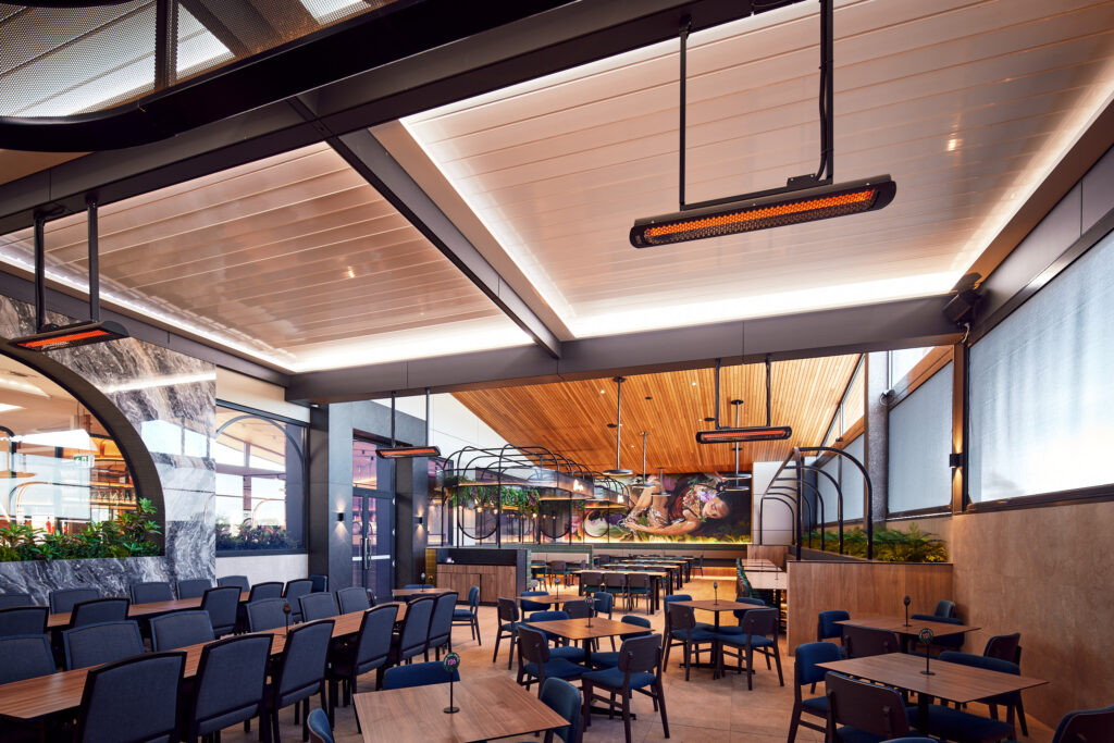 Matt Kelman, Commercial Sales Manager of Bromic’s Australian office, explains the process and thought that went into their decision, “the site offered several challenges – high ceilings, operable ceilings where we could only use certain parts of the structure and angling heat towards the patrons and feature walls that heaters could not impact patrons views of.” Kelman continues, “the Eclipse Pendant was chosen for the higher fixed ceiling area – This unit could be positioned above patrons and provide a heating and light solution. The smaller sized Eclipse Pendant also did not affect the views of the feature wall.”