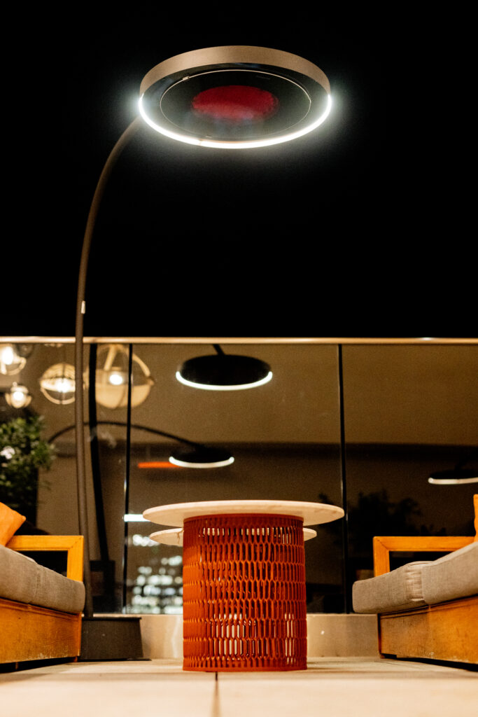 Designing for the seasons, one of the best ways to maximize comfort and increase revenue is by integrating outdoor heaters. Outdoor heaters usually come in two main different types: freestanding and mounted. Which option is best for a specific design mainly depends on how much portability and floor space will be needed. If versatility is needed and the layout might change over time, then freestanding heaters create a great value-add for clients and building owners. In turn, for more permanent installation, wall or ceiling mounted heaters may work best. In terms of architecture, high lofty ceiling members needed a solution that wouldn’t block views of the skyline and keep the floor space open to provide a cohesive overall experience.