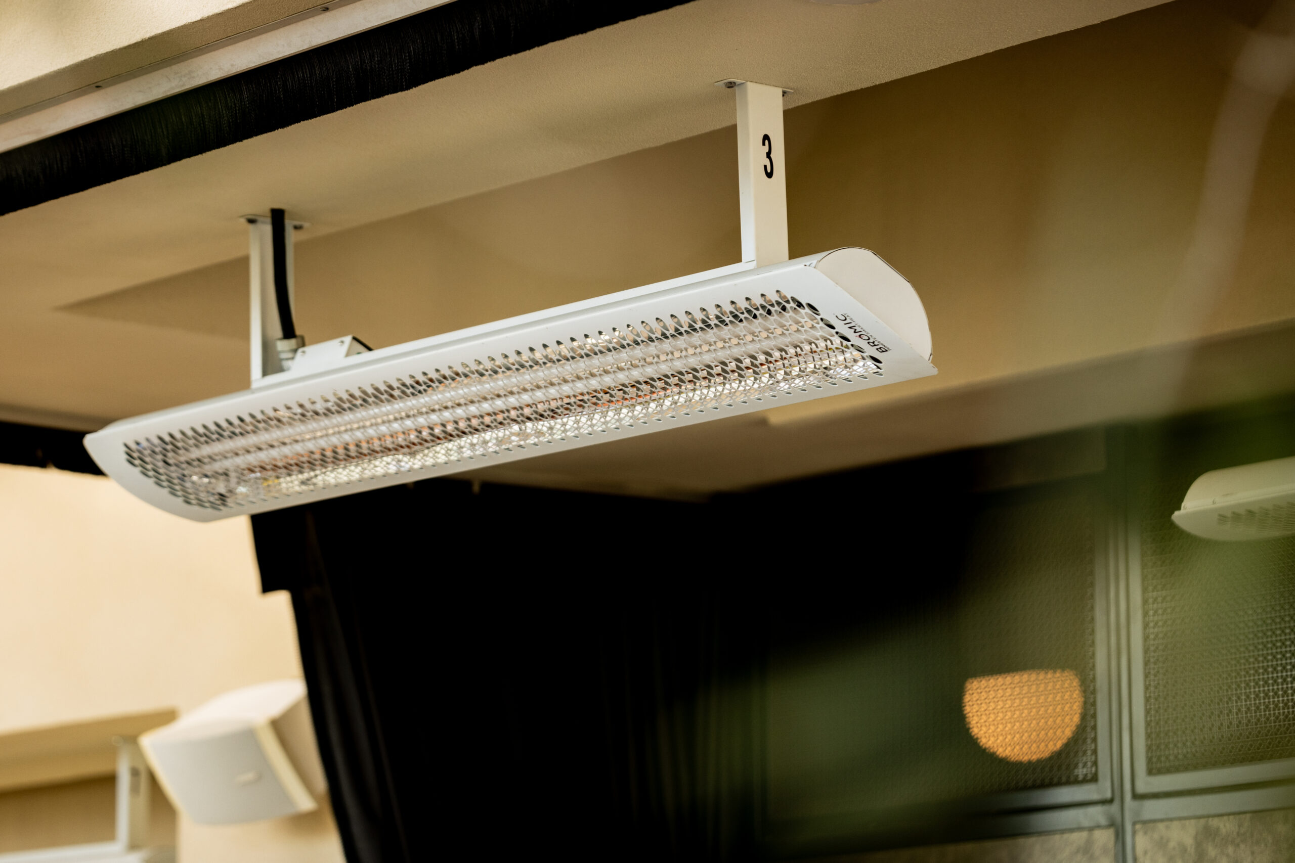 Being that this is on a rooftop and can get windy, the team wanted to use powerful Tungsten Electric heaters that are not affected by the wind like gas heaters can be. For ease of use, the heaters were hardwired to On/Off switches enabling employees to have independent control. At the same time, the white Tungsten Electric heaters blend in with the white ceiling and walls.