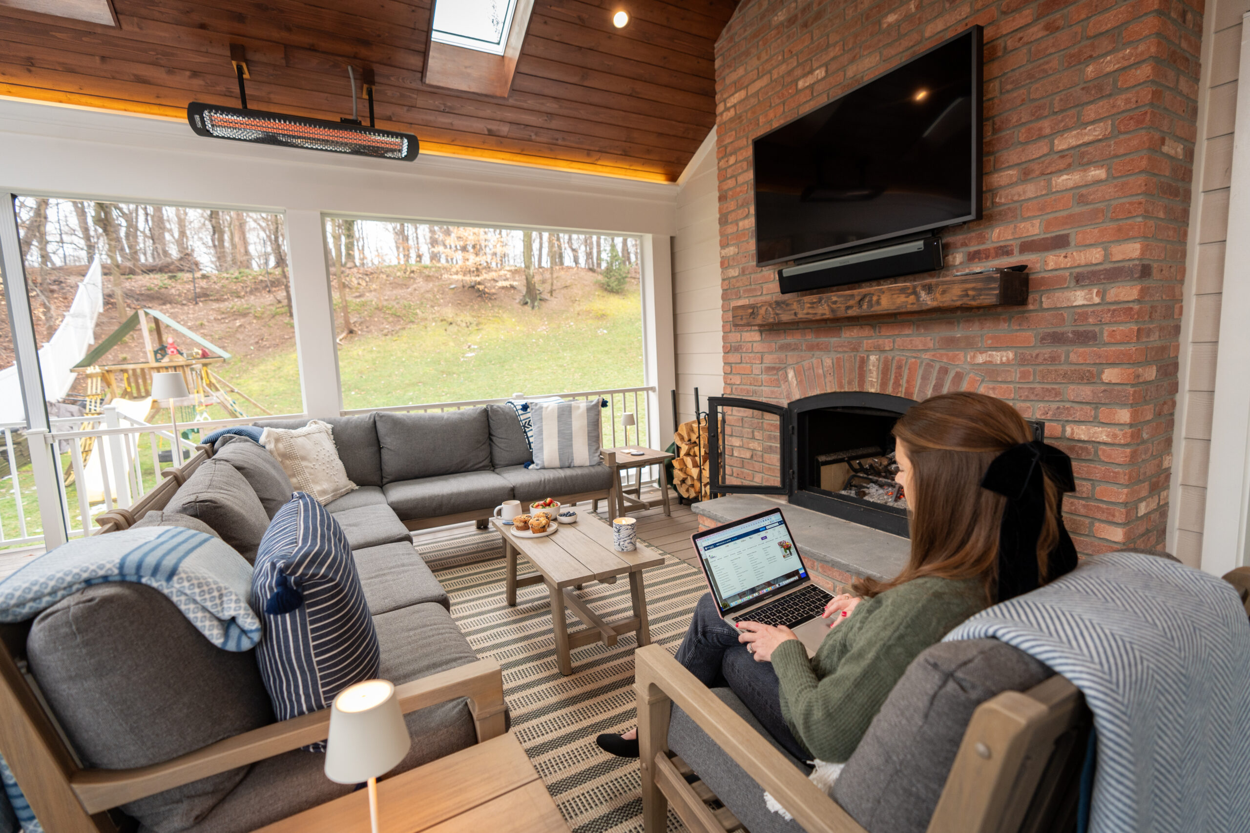 Situated in New Jersey, the home experiences diverse weather patterns, from freezing winters to scorching summers. Despite the elements, the outdoor area remains a cherished retreat, frequented throughout the year so it needed a solution that would keep its occupants warm. The core question: became how to heat a screened-in porch? Although a traditional fireplace was included in the space, knowing that this piece would be more for ambiance and comfort and a true heating solution was required, the next question that arose was what’s the best outdoor heater for screened in porches?
