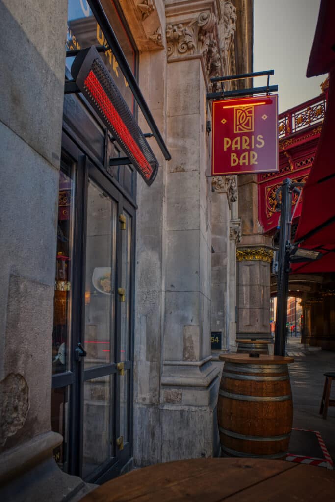 Located in the heart of the City of Farringdon, Paris Bar is a relaxed and stylish bar and grill offering premium brands, world wines and designer cocktails. Surrounded by office spaces, the covered outdoor area quickly becomes filled with customers who are leaving work and want to spend a little time outdoors after being in the office all day for a bite and a drink or two before heading on their way. Because of the high request for outdoor dining, a heating solution became a necessity, especially for the colder months. With the industrial look of the brick building Paris Bar resides within, the Tungsten Electric outdoor heater was clear to be the perfect solution. The dual elements of the 6kW heater projected enough heat to keep those dining in the outdoor space warm during their meals. The On/Off controller was installed making on/off capabilities easy for those controlling the heaters.