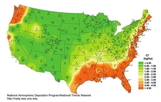 Corrosion rates depend on the amount of salt spray in the air and vary considerably from region to region. Although oceanfront buildings will always be more severely affected than buildings farther inland, studies have shown that salt air can affect metal more than 50 miles inland. In some regions salt penetration has been found even further inland. Florida, for example, has recorded some of the highest salt deposits, affecting structures even up to 100 miles inland.